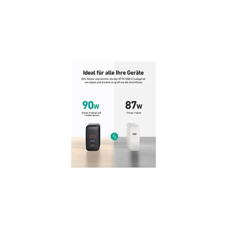 Kompakt und effizient: Obwohl die Anschlussgröße des 87-W-Ladegeräts dreimal so groß ist, ist es 20 % kleiner und verbraucht 40 % weniger Energie. Perfekt für 15-Zoll-PCs und andere leistungsstarke USB-C-Laptops. Faltbare Stecker und ein reisefreundliches Design sorgen für maximale Mobilität, wohin Sie auch gehen.Gut für Zuhause, Büro und Urlaub